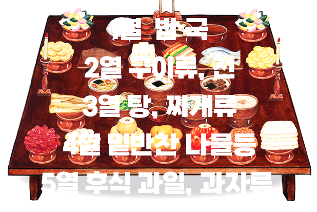 차례상 차리는 방법은 지방과 가문에 따라 다릅니다. 대체적으로 5열로 차리게 되고, 신위가 있는 쪽은 1 열이라고 생각하시면 됩니다.